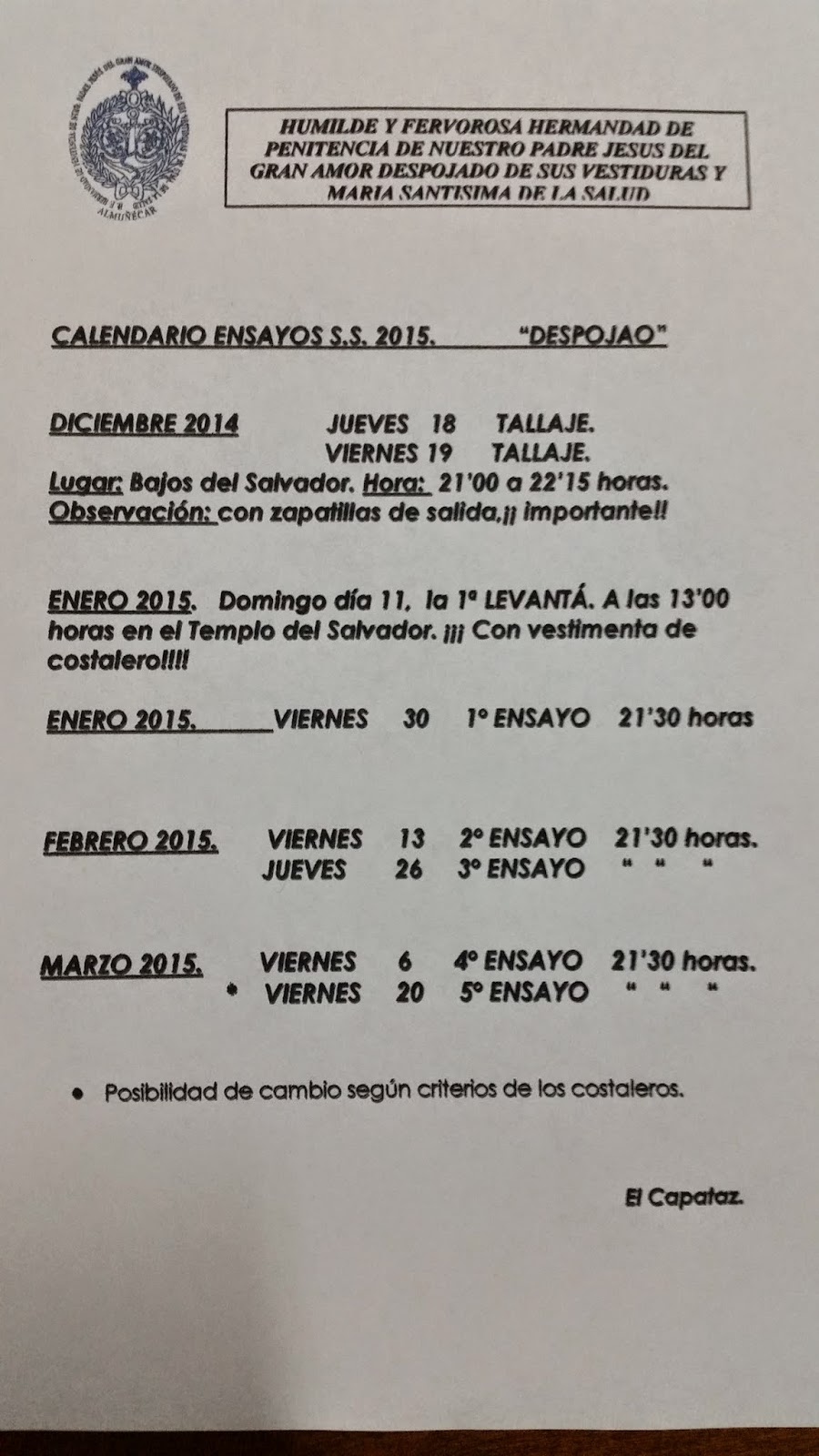Adjuntamos el calendario de ensayos de la cuadrilla de costaleros del Paso de Cristo, si quieres formar parte de la cuadrilla, pásate por los bajos del Templo del Salvador el jueves o viernes próximo de 21:00 a 22:15h.